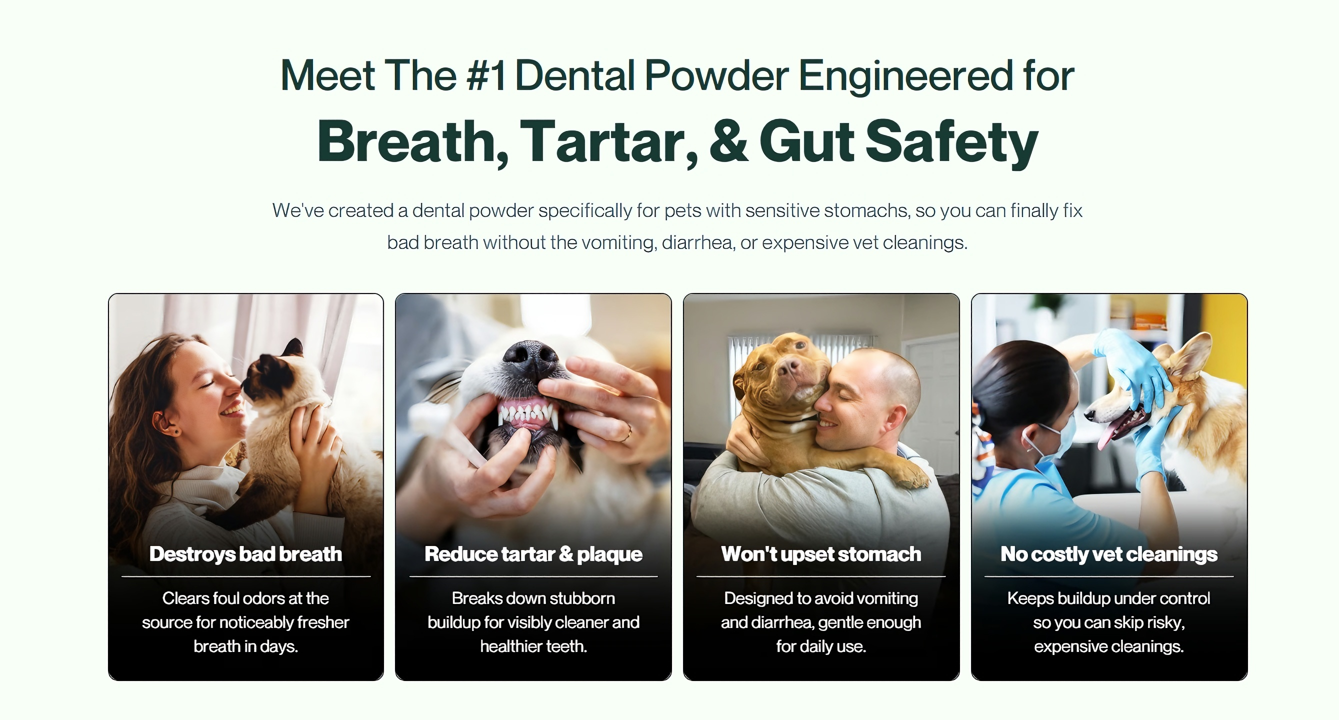 Natural Dog Dental Powder: Fresher Breath & Cleaner TeethThis USA-made, artificial-free powder beats dental chewsβabsorbs odors (zeolite + pomegranate), reduces tartar/plaque (brown algae + cranberry), and freshens breath in a week. Just sprinkle over food daily (no brushing!)βdogs love the bacon flavor. Gentle on sensitive tummies with marshmallow root and chamomile, no upset digestion. The easy, delicious dog dental care essential.